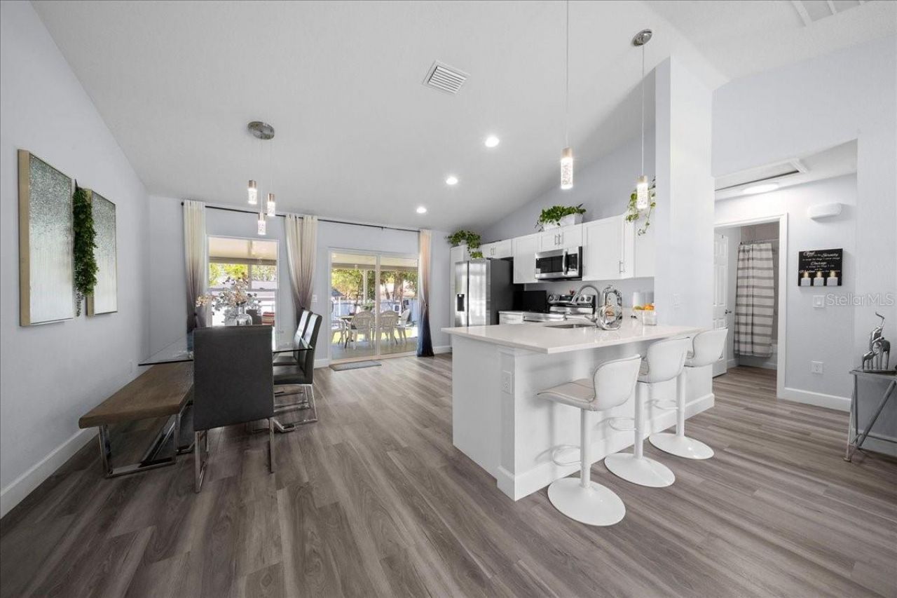 Welcome to this beautifully built 2024 home in the desirable community of Rolling Ranch Estates! This move-in ready residence offers 3 bedrooms, 2 bathrooms, and a spacious 2-car garage, thoughtfully designed with a modern open-concept layout and a split floor plan for added privacy. Enjoy stylish laminate flooring throughout, vaulted ceilings, and a bright, inviting living space perfect for both everyday living and entertaining. The kitchen features elegant quartz countertops with shaker cabinets. Step outside to a covered lanai complete with an outdoor kitchen-ideal for enjoying Florida living year-round. Additional upgrades include a whole-house water filtration system, aluminum fencing for added security, and a convenient utility shed for extra storage. Ideally located just a short drive from Rainbow Springs State Park and only 25 minutes from the World Equestrian Center, this property offers both tranquility and accessibility. With no HOA and no lease restrictions, this home provides flexibility and freedom for homeowners and investors alike. Don't miss this exceptional opportunity to own a newer upgraded home in a peaceful and growing area!